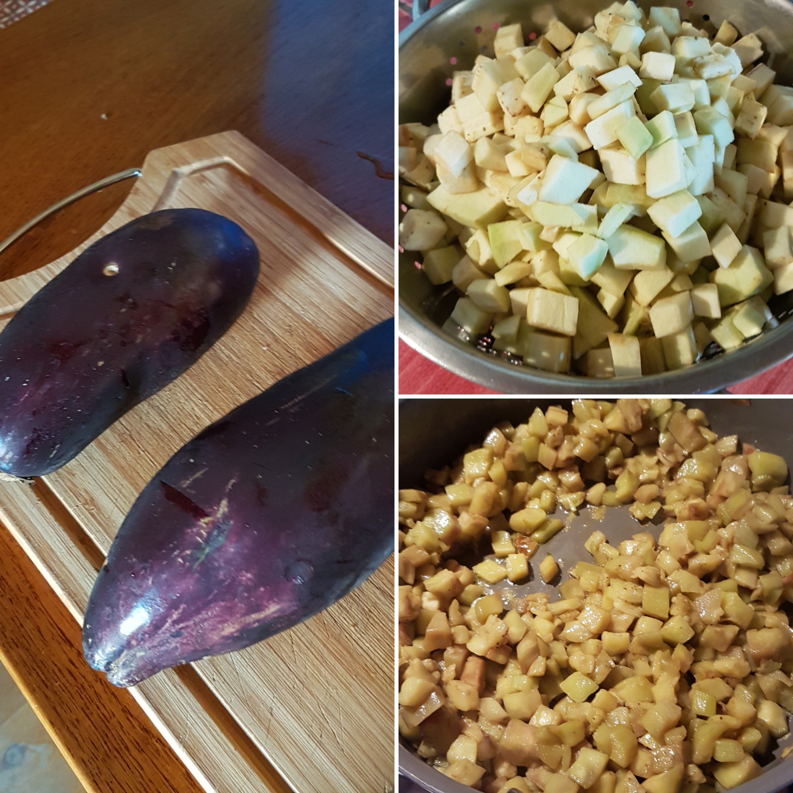 Epluchez puis détaillez vos aubergines en petits cubes (épépinez les si nécessaire). Versez 2 cuillères à soupe d'huile d'olive dans une grande poêle (ou un wok pour bien répartir la chaleur et diminuer le temps de cuisson). Déposez vos cubes d'aubergine puis arrosez de 2 autres cuillères à soupe d'huile d'olive. Salez puis faites chauffer à feu doux en remuant régulièrement. Lorsque les aubergines ont pompées toute l'huile, rajoutez à nouveau 2 cuillères à soupe d'huile d'olive. Poursuivez la cuisson jusqu'à que ce que les aubergines soient tendres et bien juteuses. Réservez.